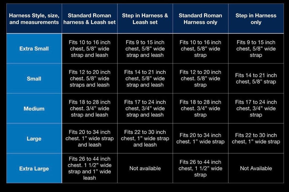 Extra Small fits 9'-15" chest Girth - comes in 1/2” width strap - avg weight max 10 lbs full grown.