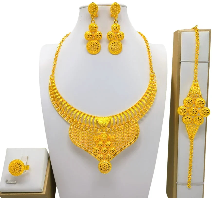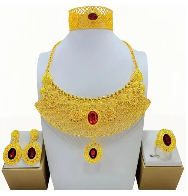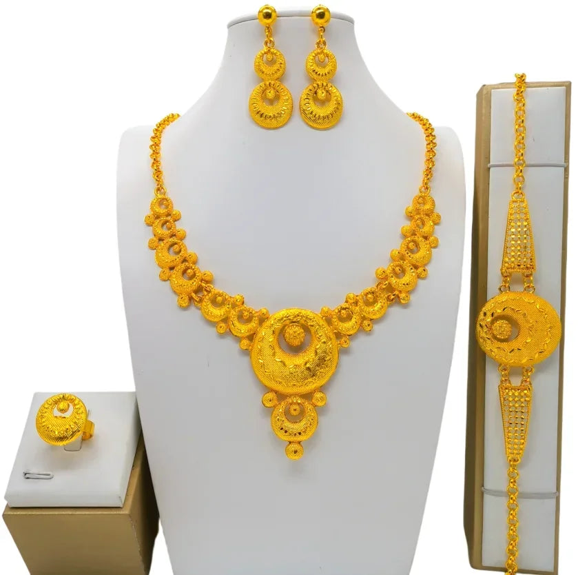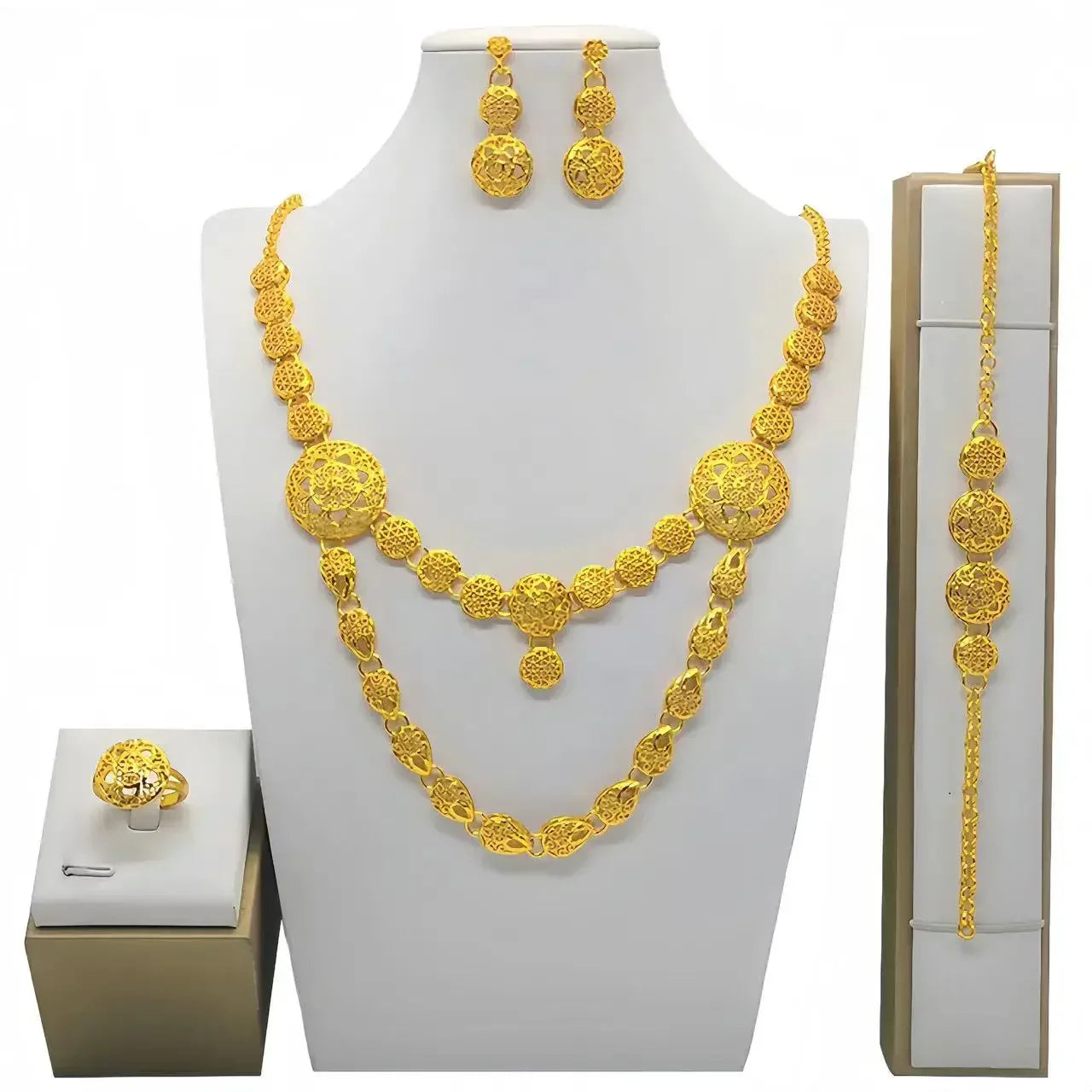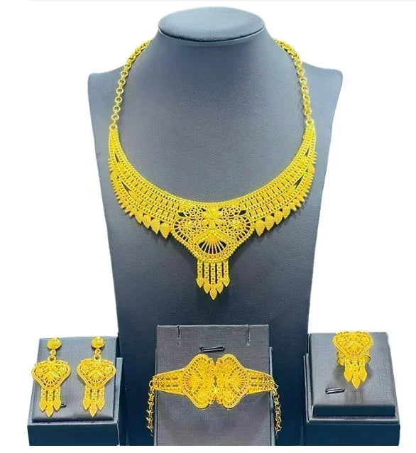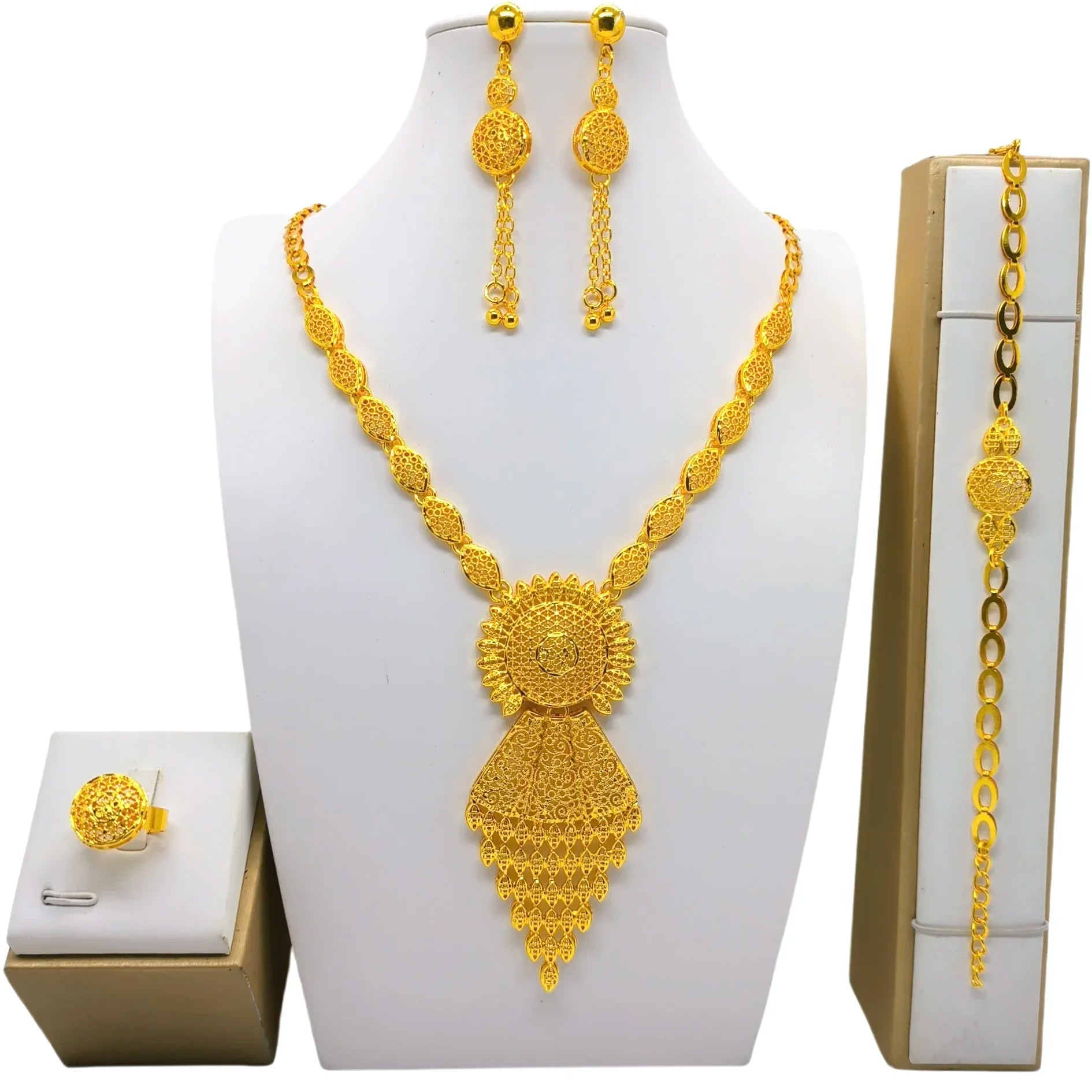 France Ethiopian Gold Color Jewelry Set For Women Dubai Necklace Bracelet Earrings Ring Set African Wedding Choker Wholesale