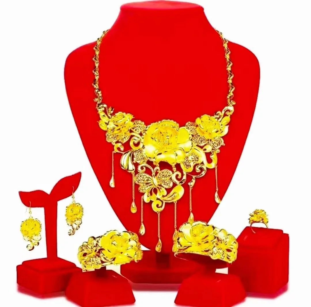 Hot Sale Luxury Trendy Popular Fashion Wedding Necklace Earrings Bracelet Ring New Arrivals Copper Gold Plated Party Gift Anniversary Jewelry Set