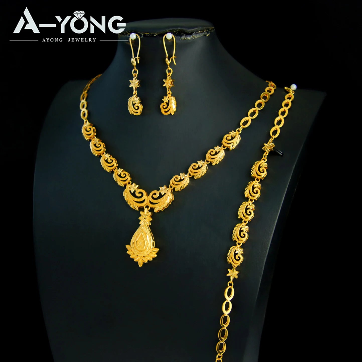 Luxury Dubai Wedding Jewelry Set 21k Gold Plated Arab Bridal Gold Necklace Bracelet Earrings Brazilian Women Vintage Jewelrys