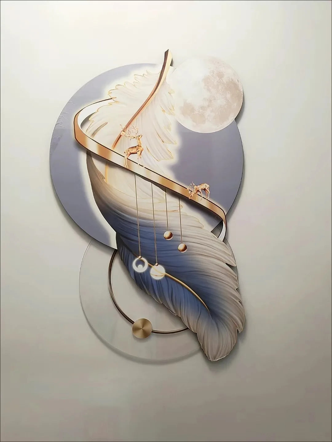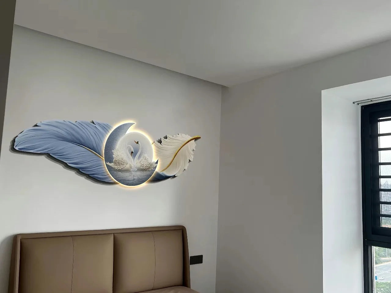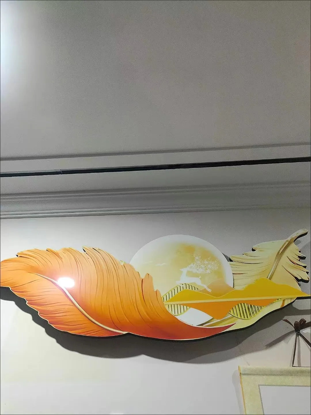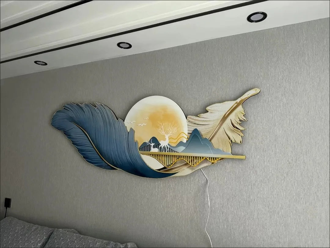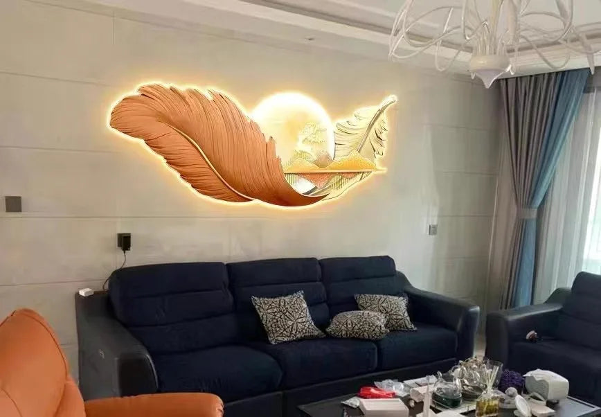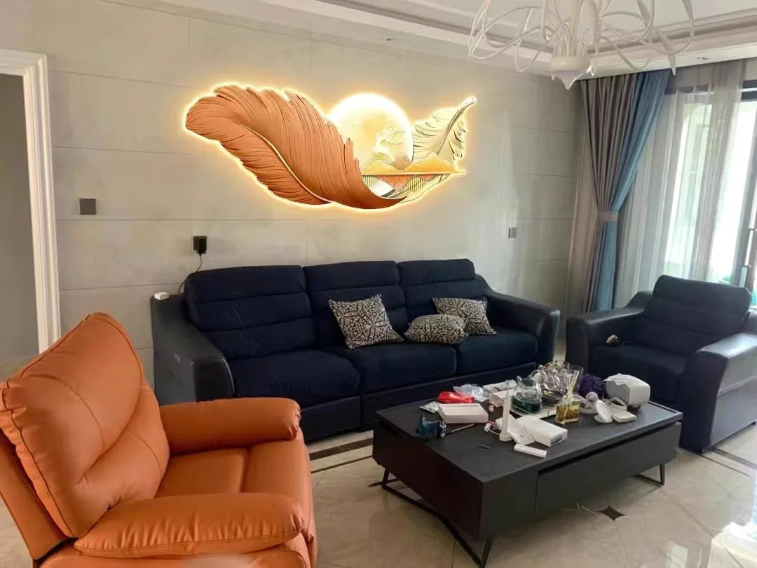 Luxury Feather Living Room Home Decoration Painting Light Luxury Sofa Background Wall Carved Wall Art LED Wholesale Custom