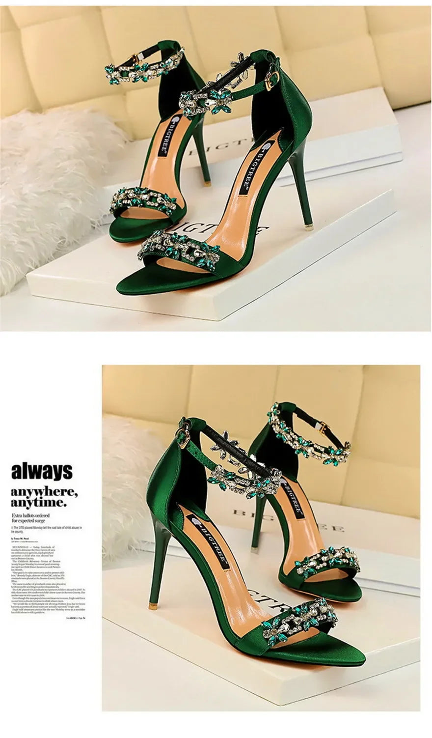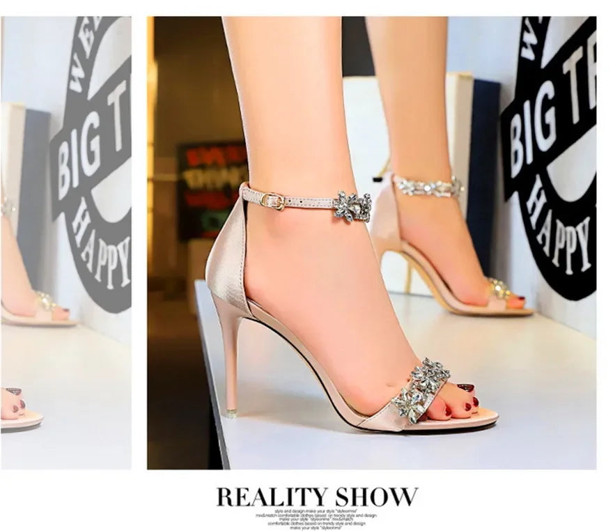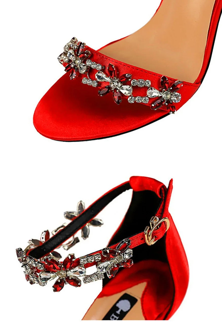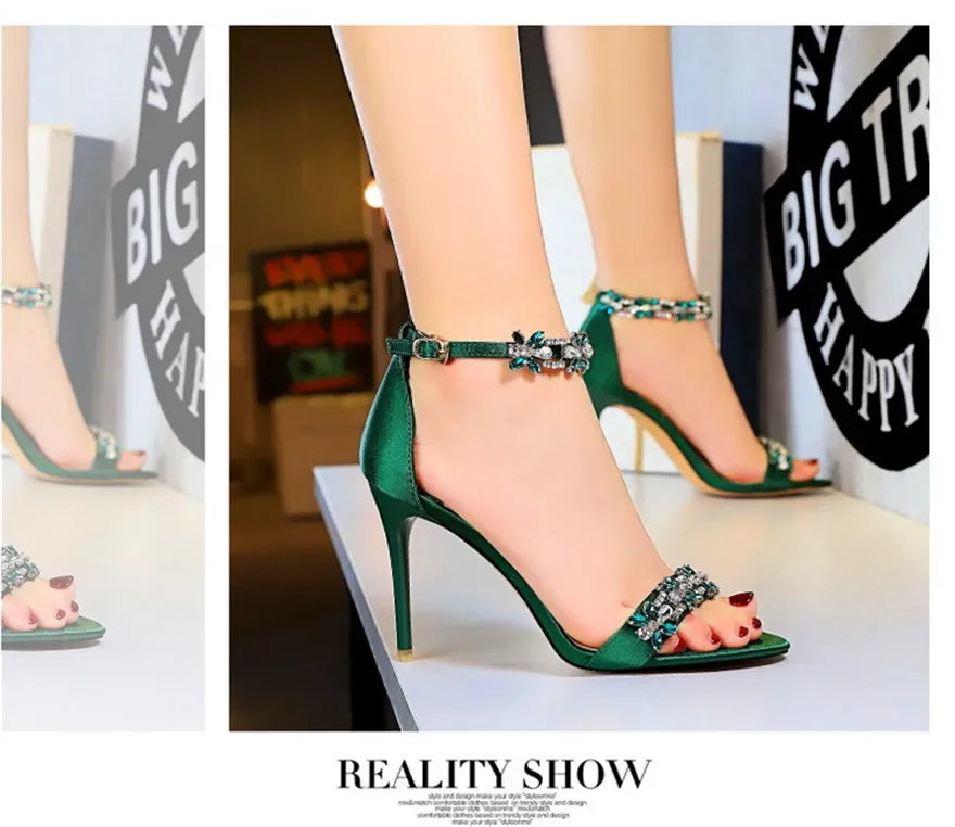 Soft Silk Open Toe Women Sandals 2024 Summer Luxury Crystal Ankle Buckle High Heels Shoes Bride Party Lady Green Red Black Pumps