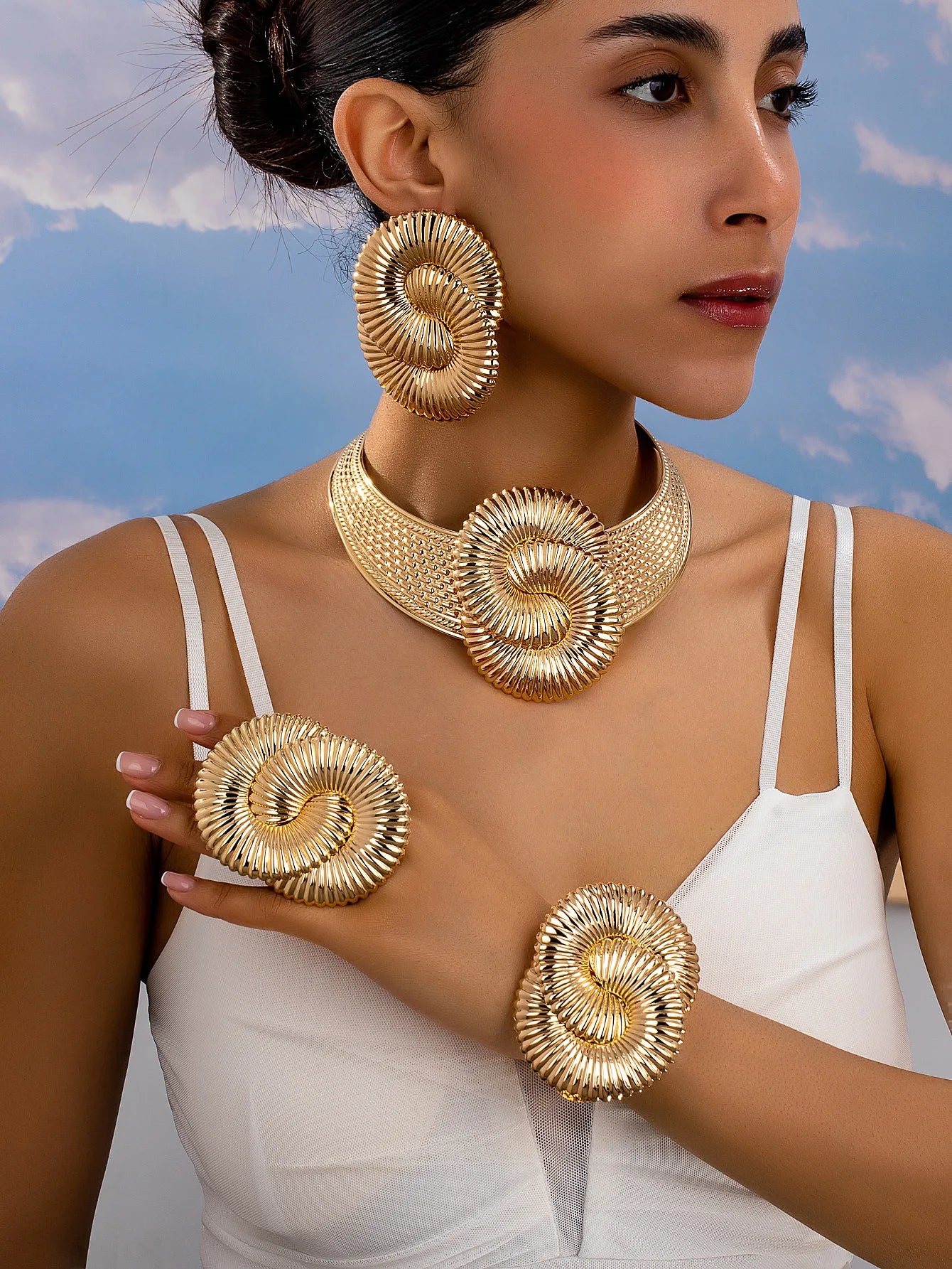 The figure-eight earrings sway gently with every movement, adding a touch of whimsy. The matching ring and bracelet feature bold, bohemian-inspired details. The entire gold ensemble glows softly under light, elevating any basic outfit.