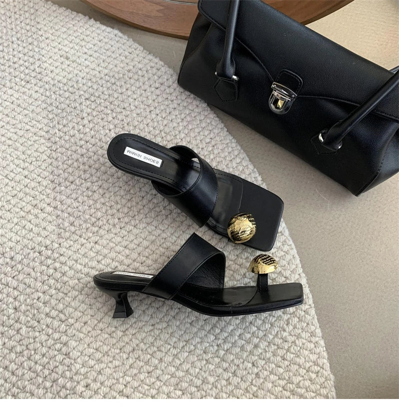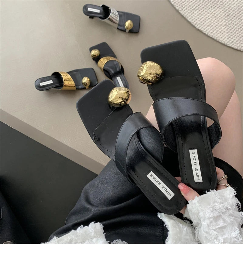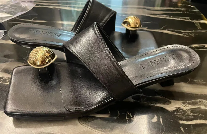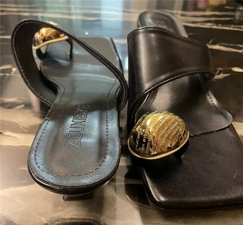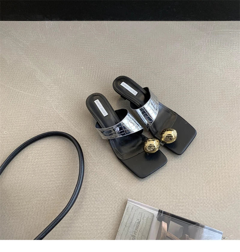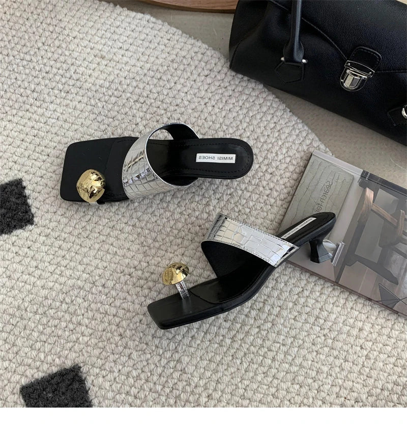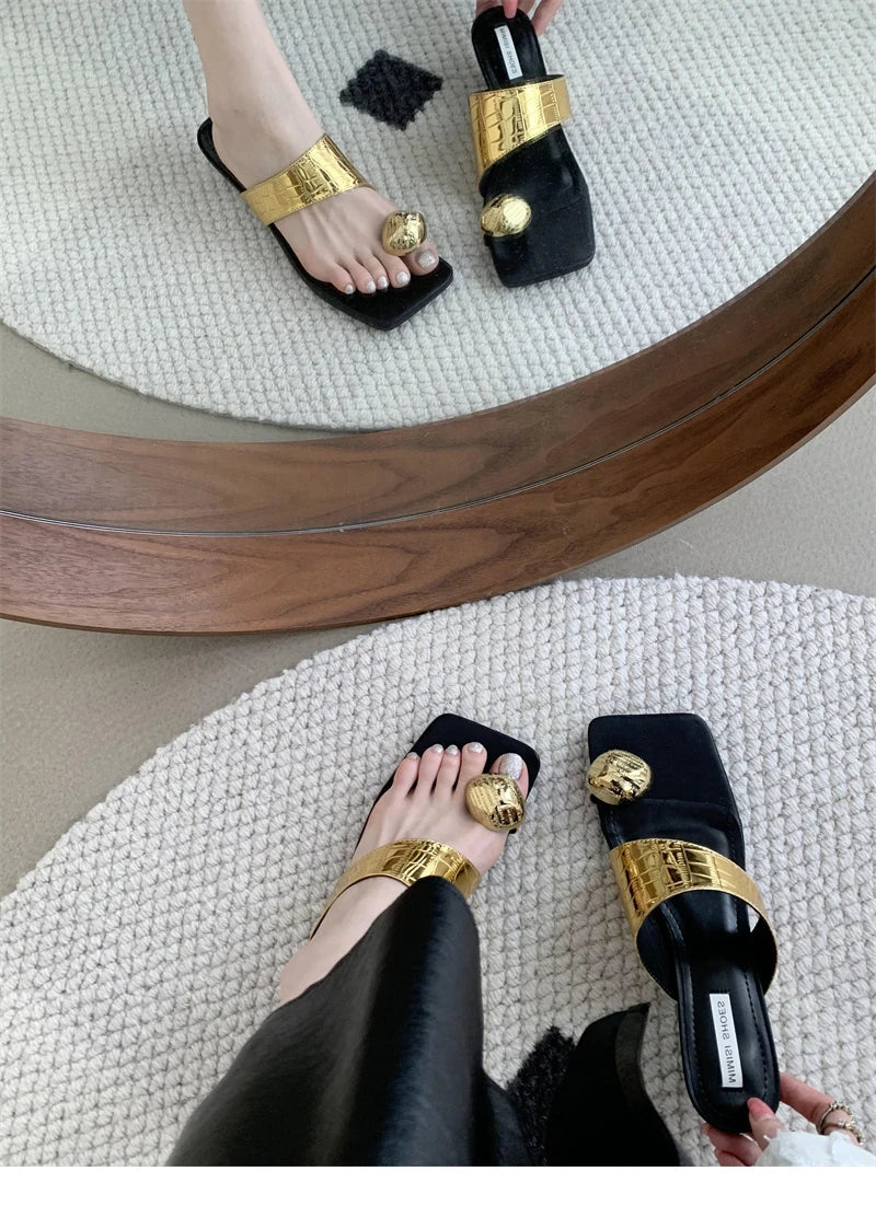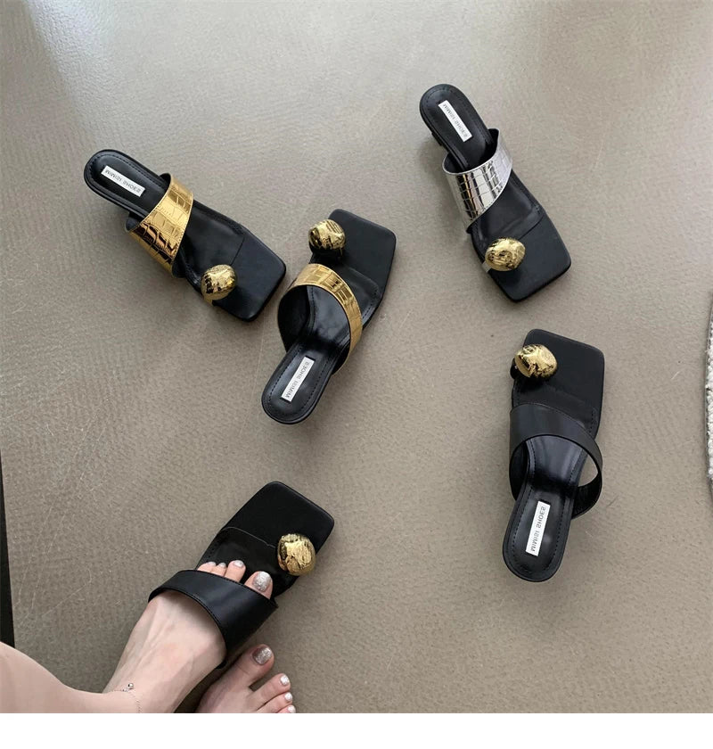 2023 Summer New Fashion Metal Clasp Toe Clamping Square Heel Medium Heel Sandals Women's Shoes Fashion Slippers