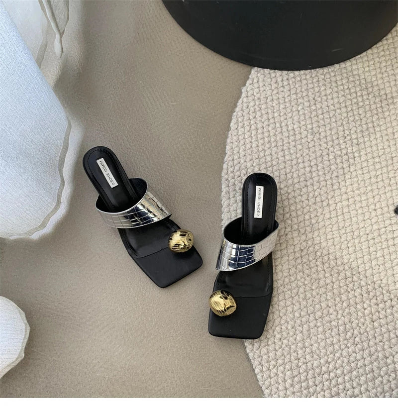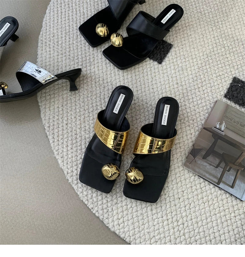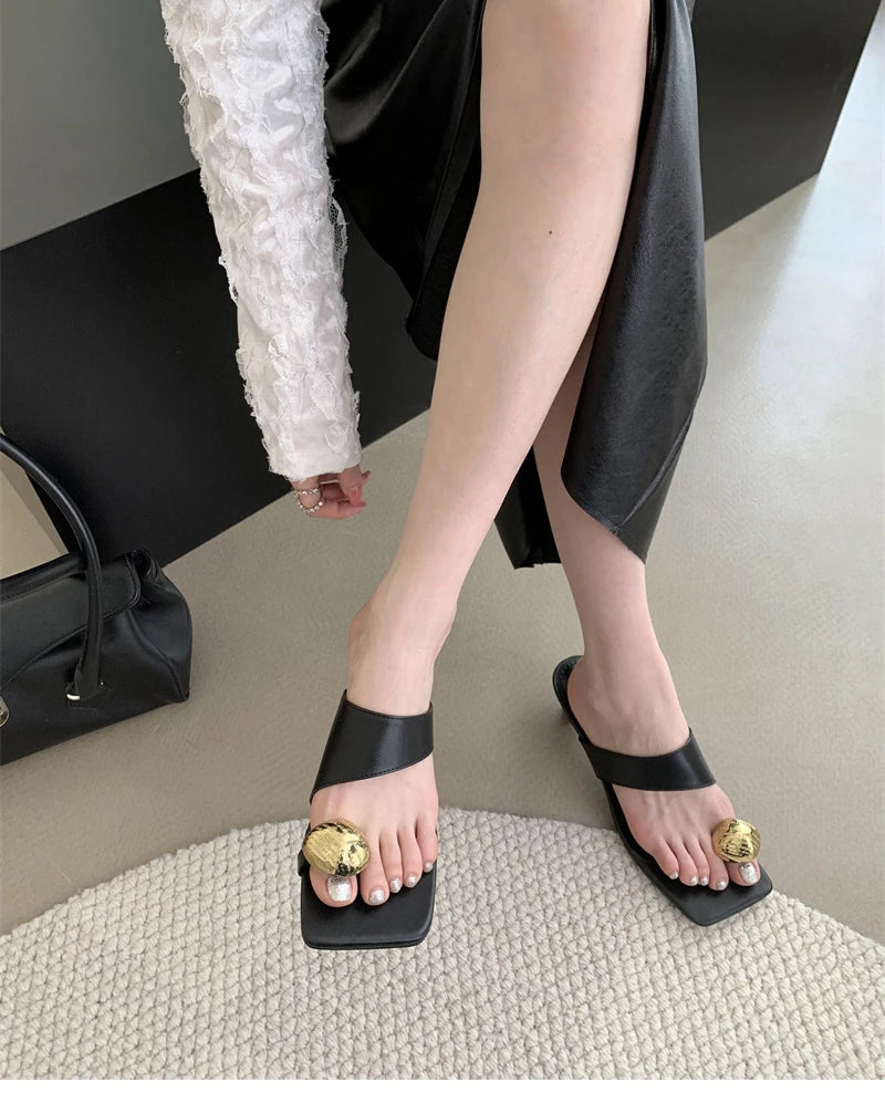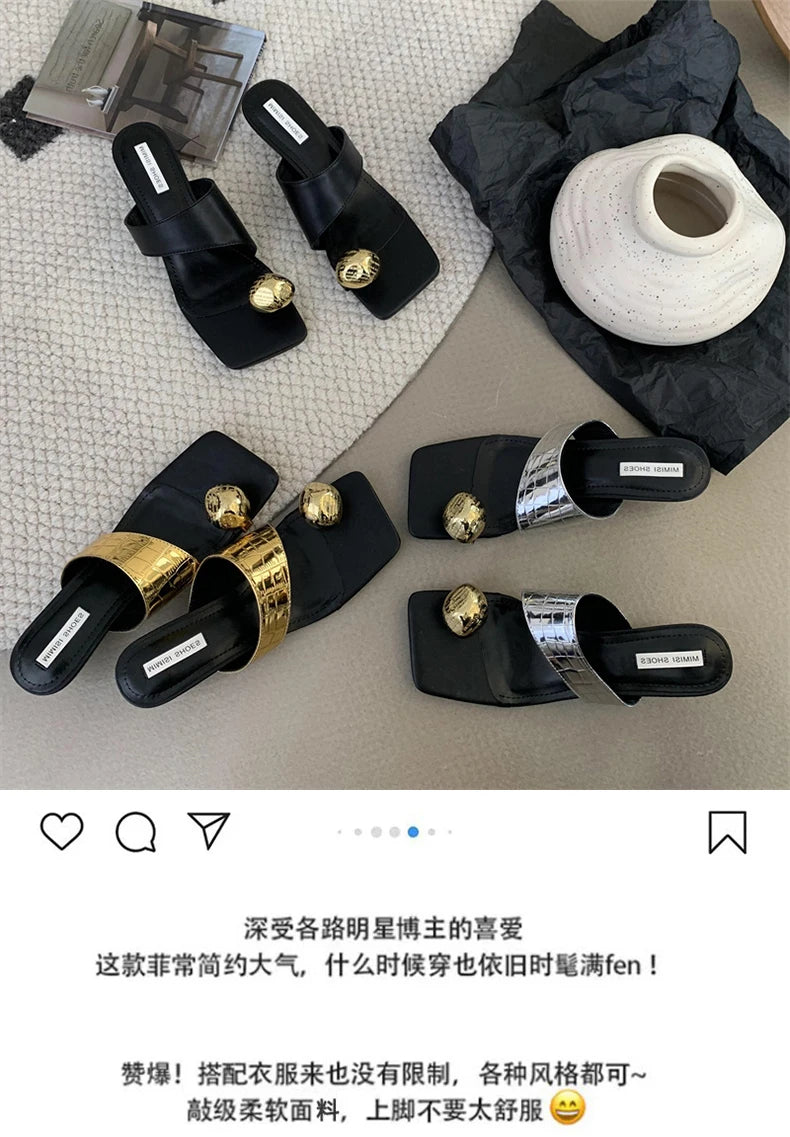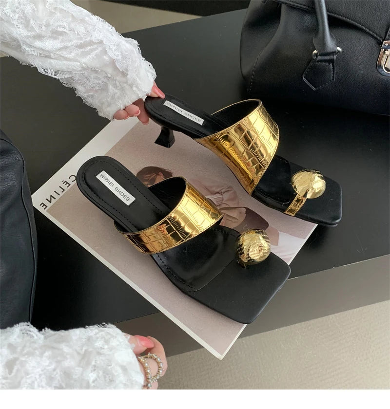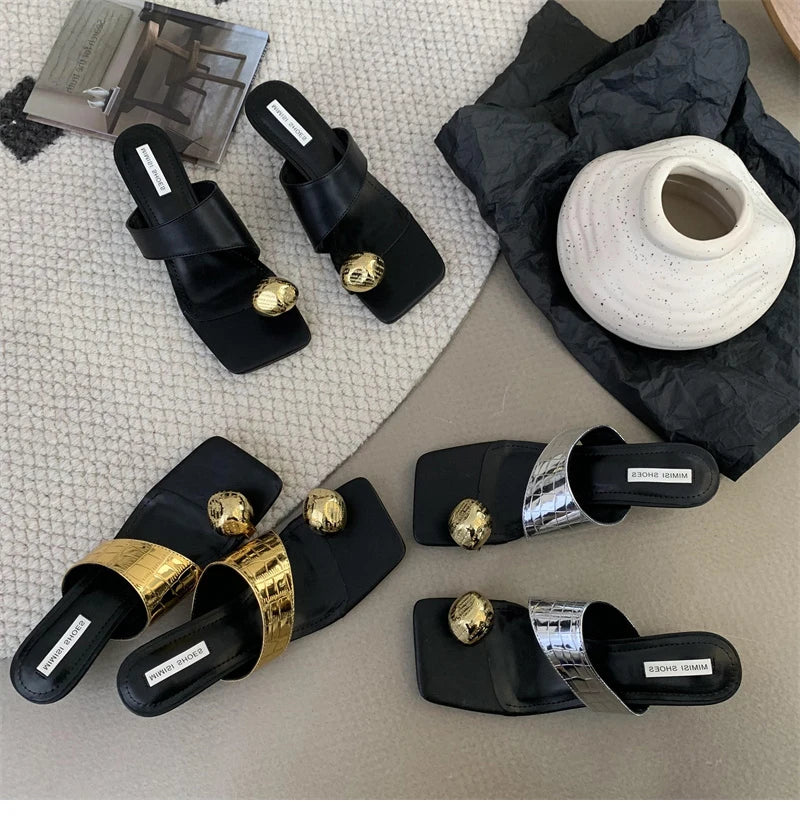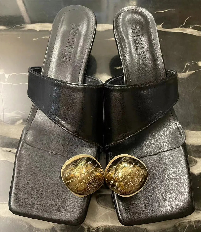 2023 Summer New Fashion Metal Clasp Toe Clamping Square Heel Medium Heel Sandals Women's Shoes Fashion Slippers