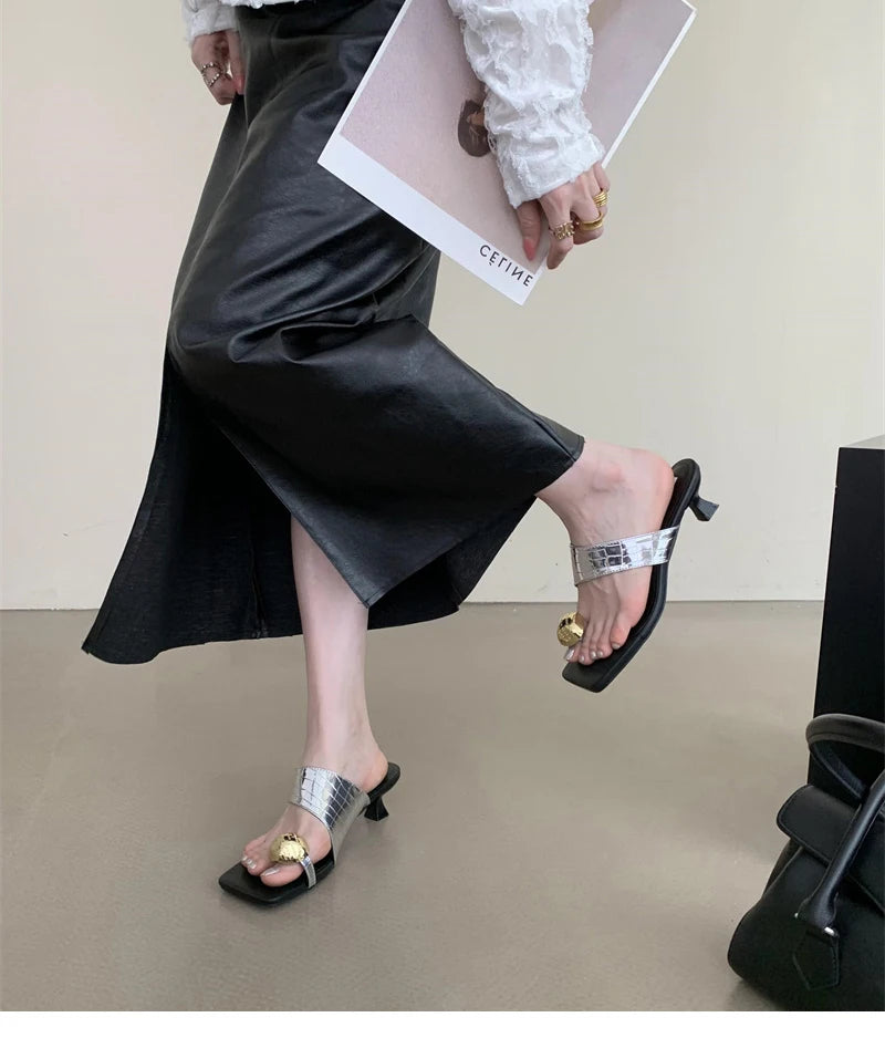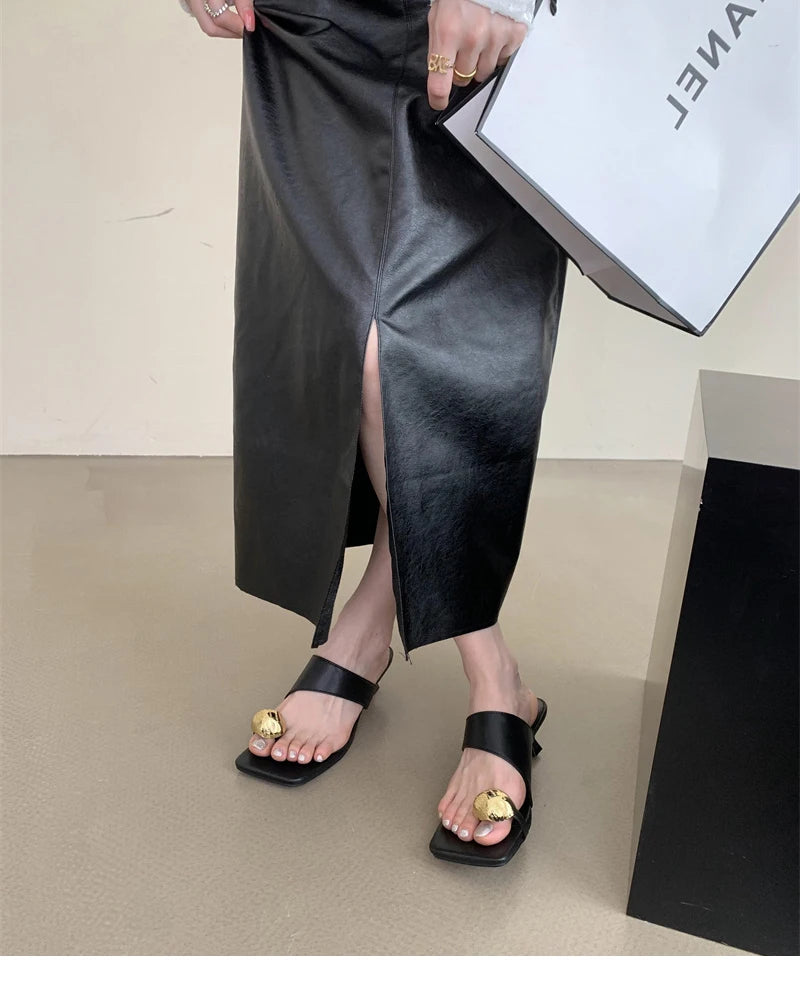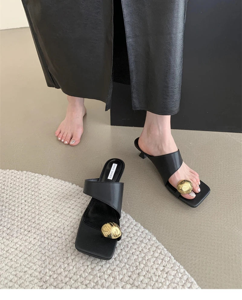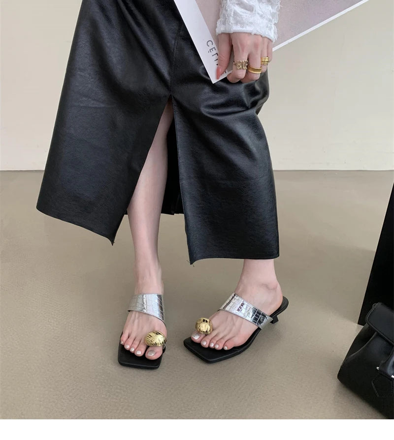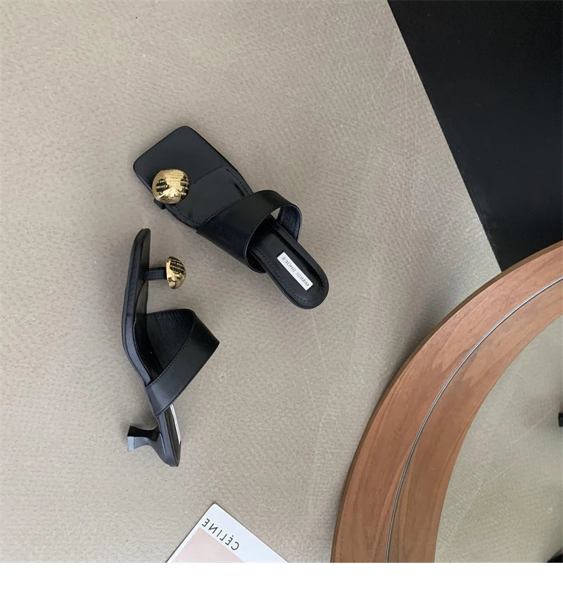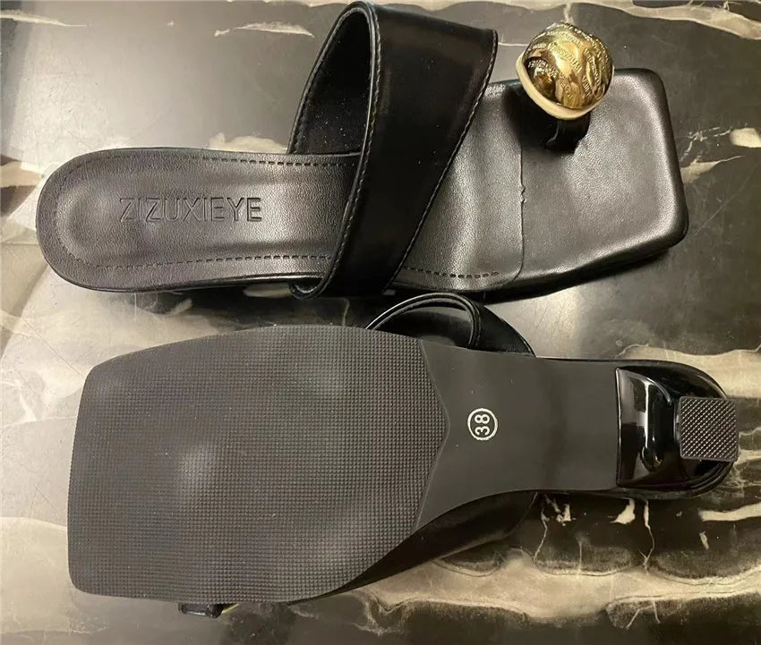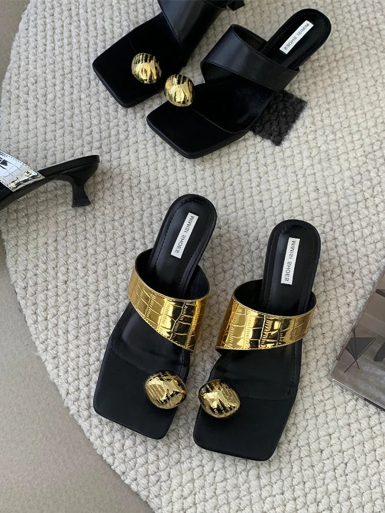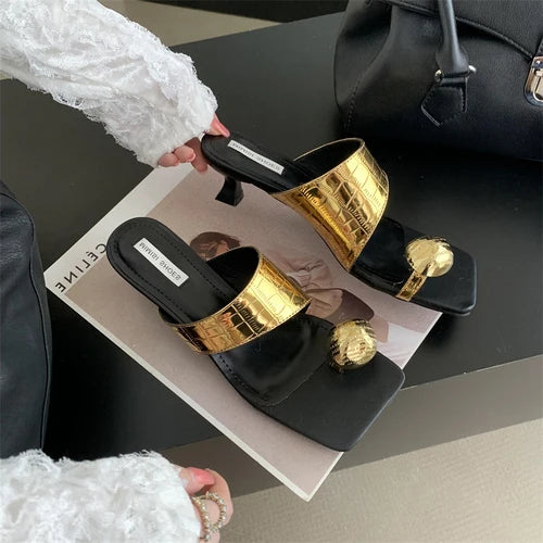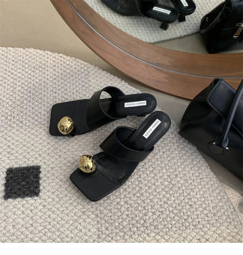 2023 Summer New Fashion Metal Clasp Toe Clamping Square Heel Medium Heel Sandals Women's Shoes Fashion Slippers