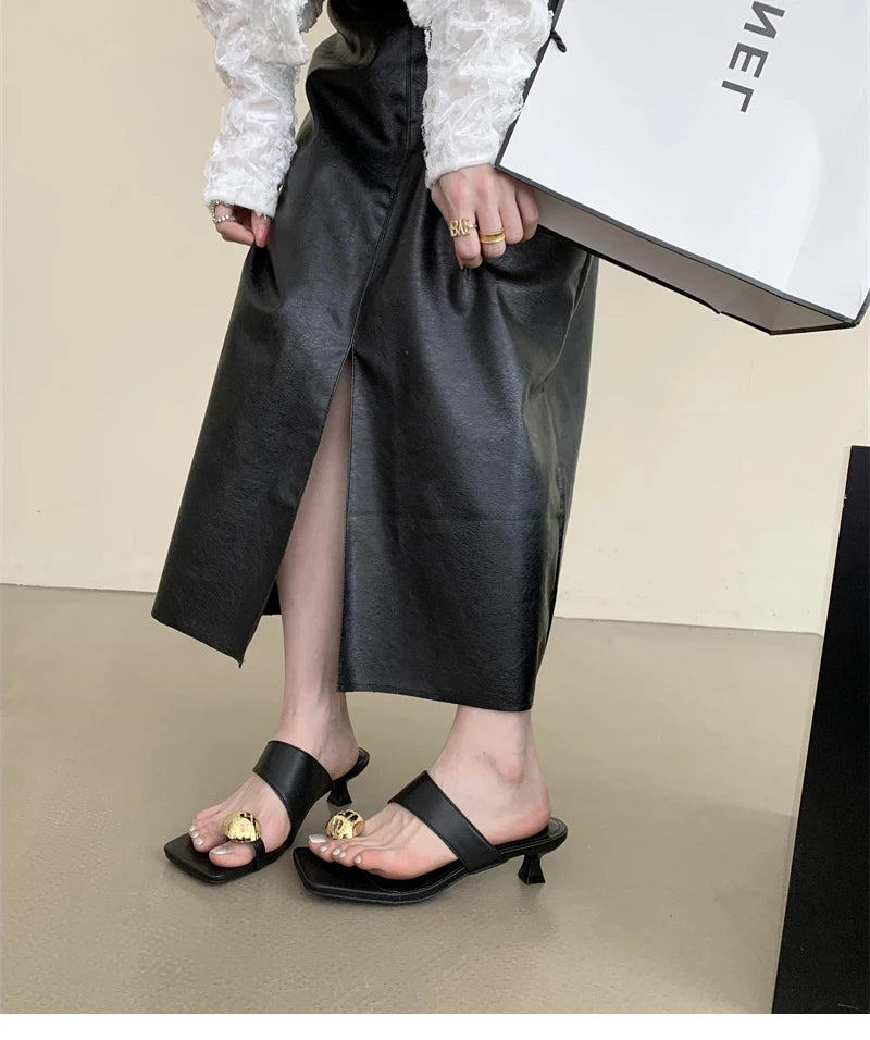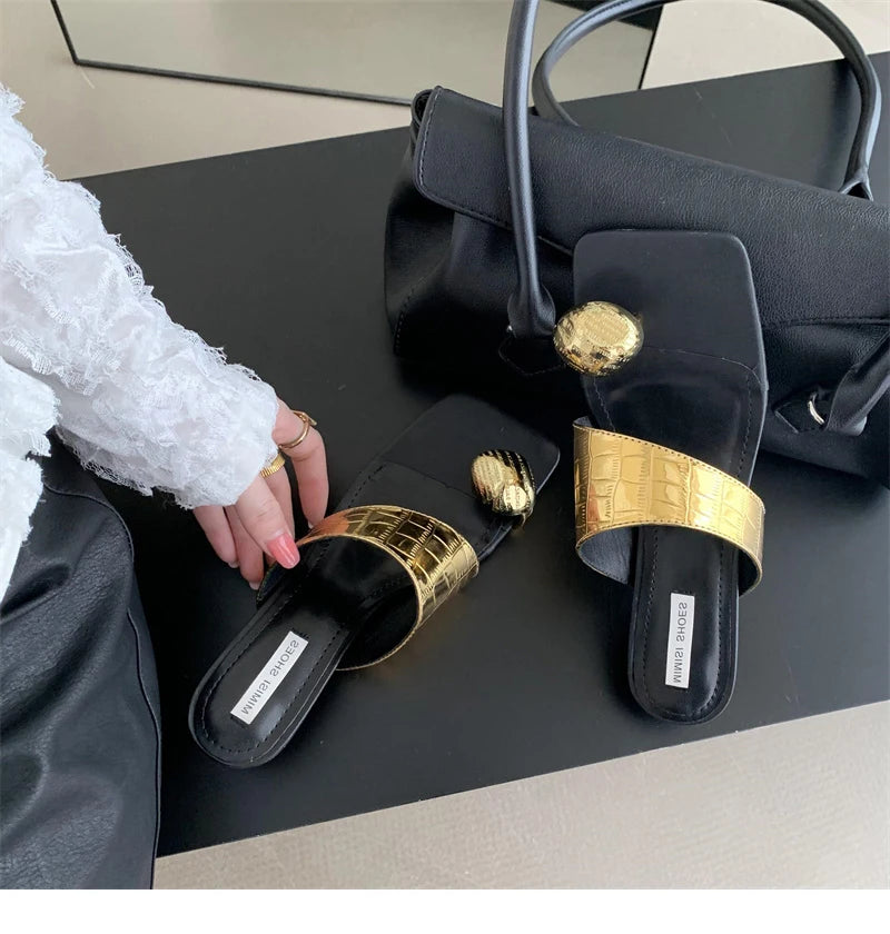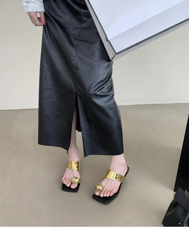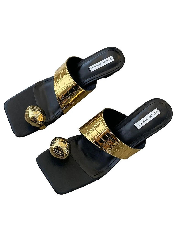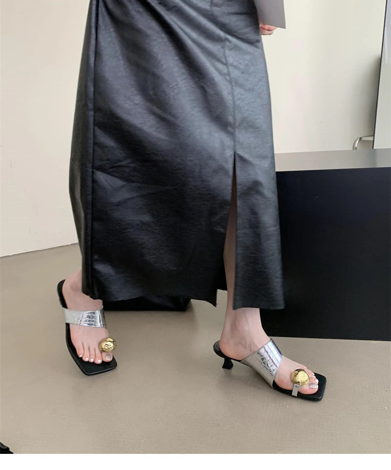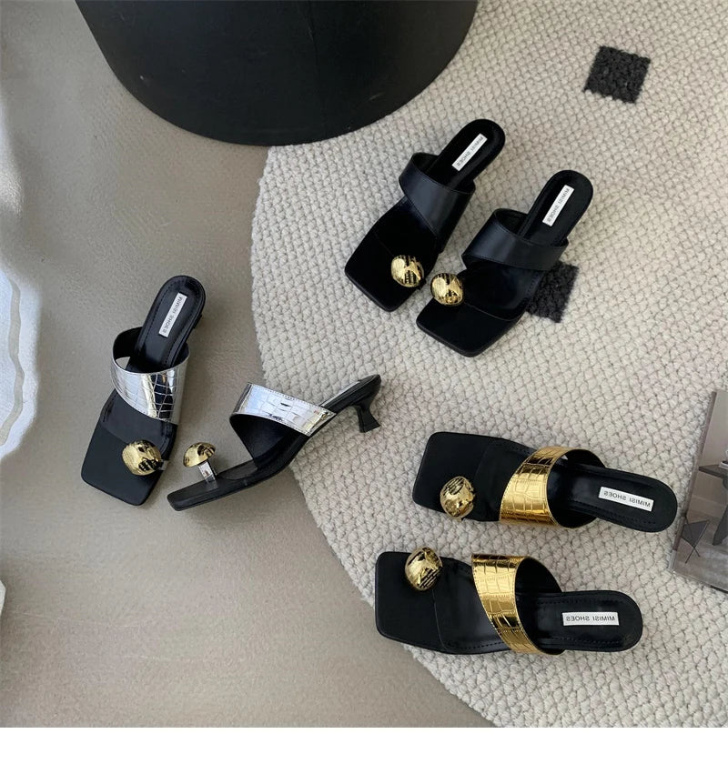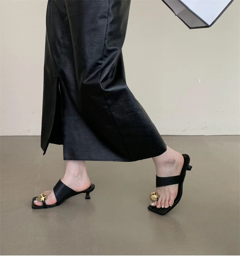 2023 Summer New Fashion Metal Clasp Toe Clamping Square Heel Medium Heel Sandals Women's Shoes Fashion Slippers