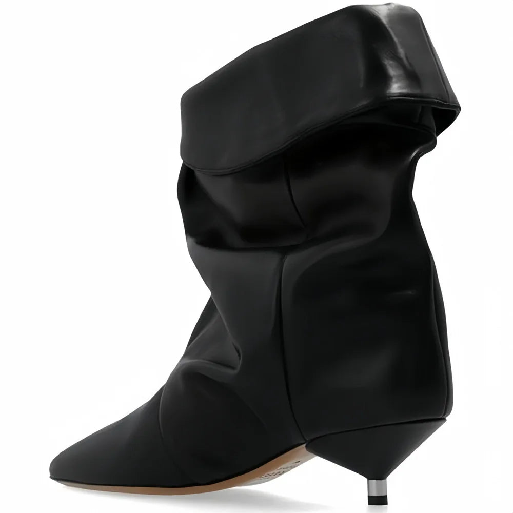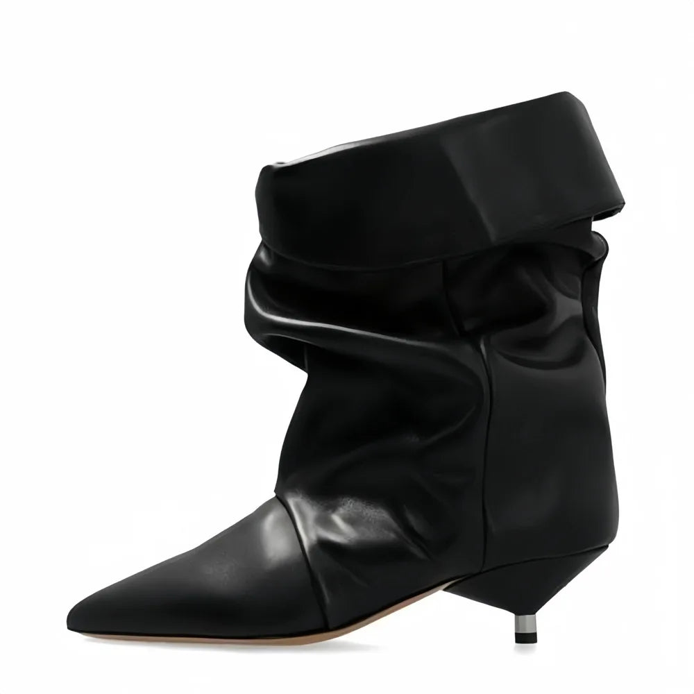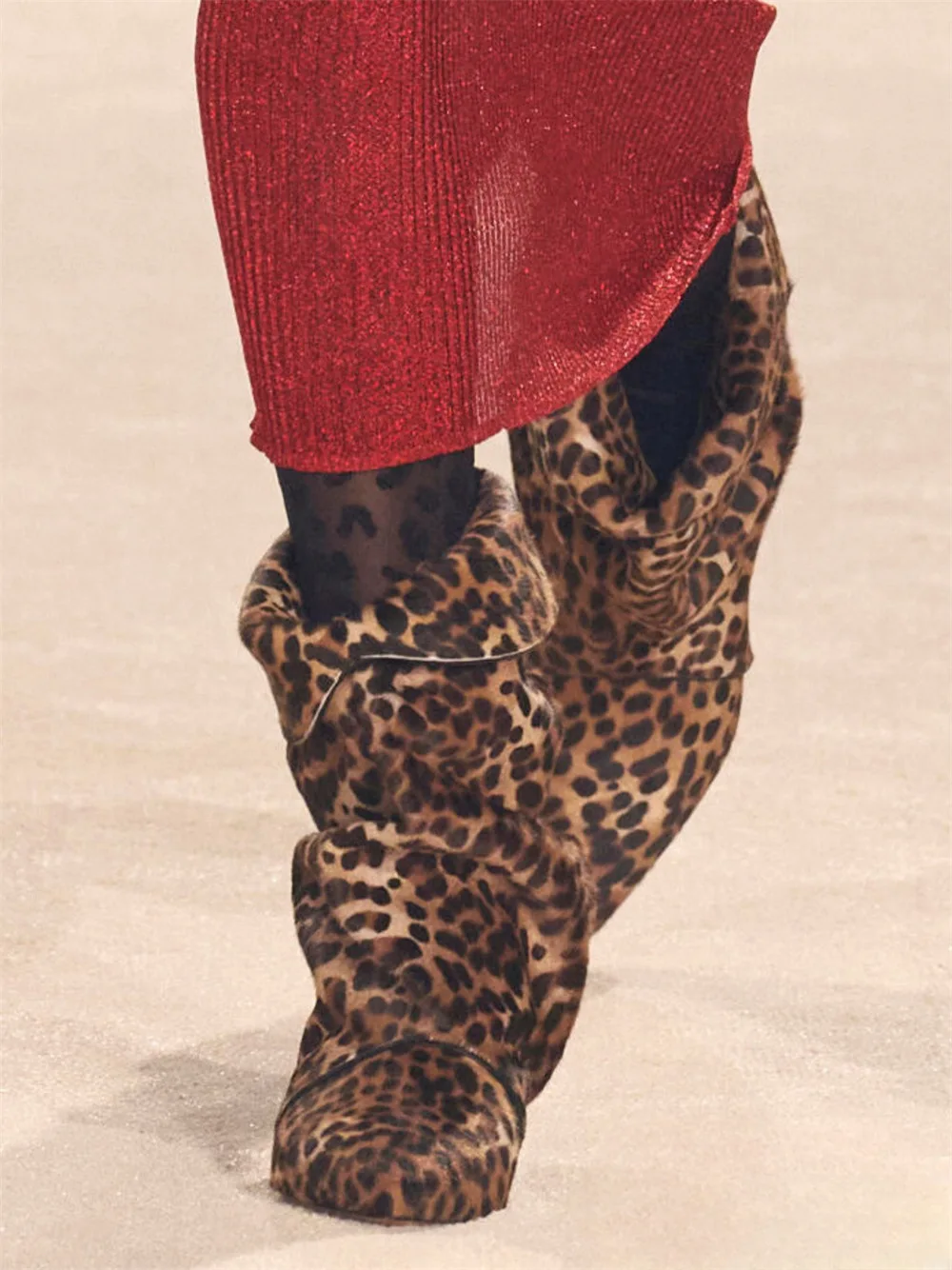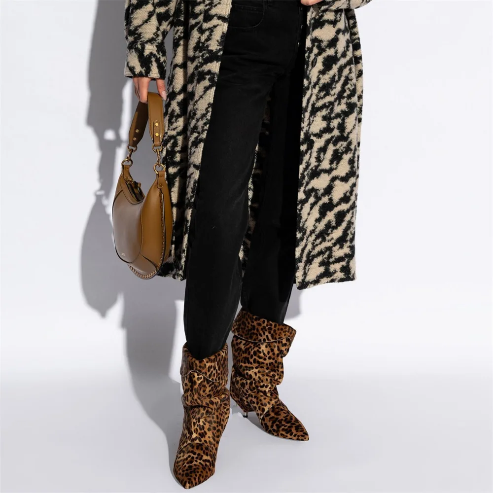 Arden Furtado 2025 Spring leopard print Large tubular boots Pointed toe Slip-on Pleated Middle heel Modern boots Short boots