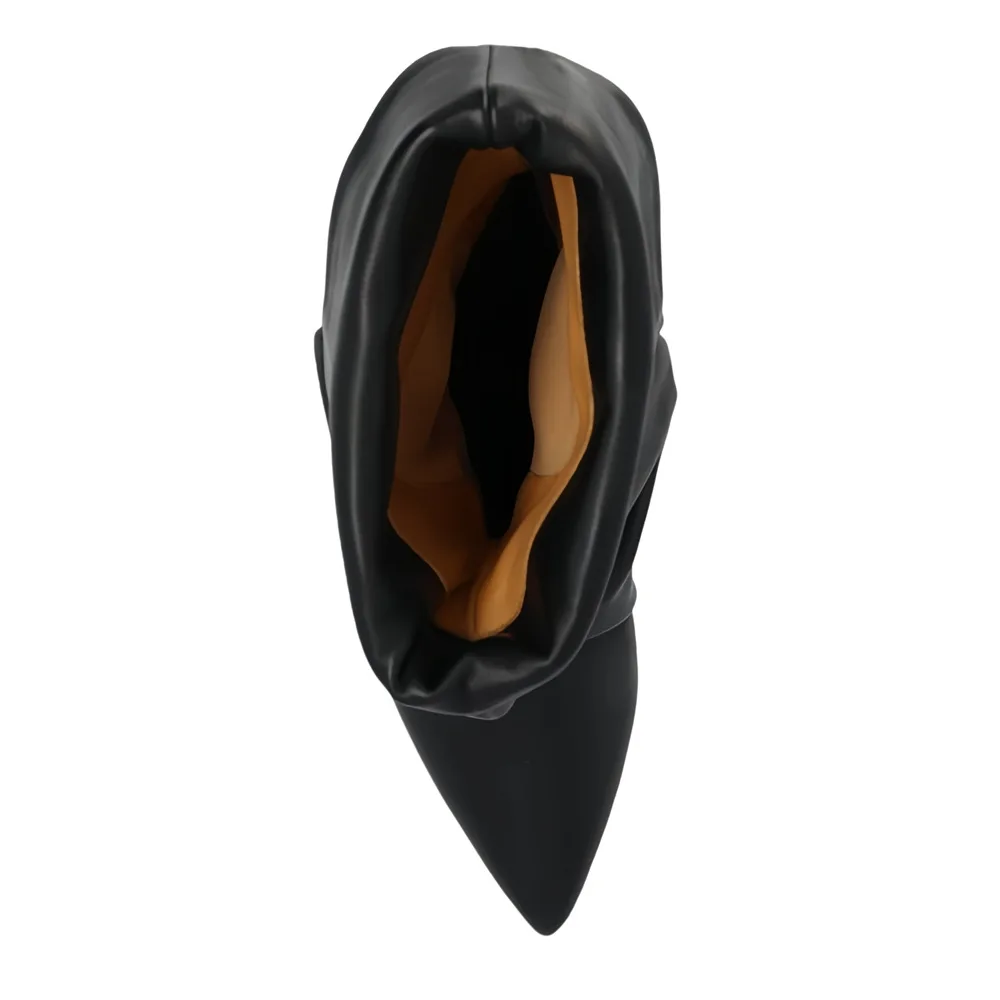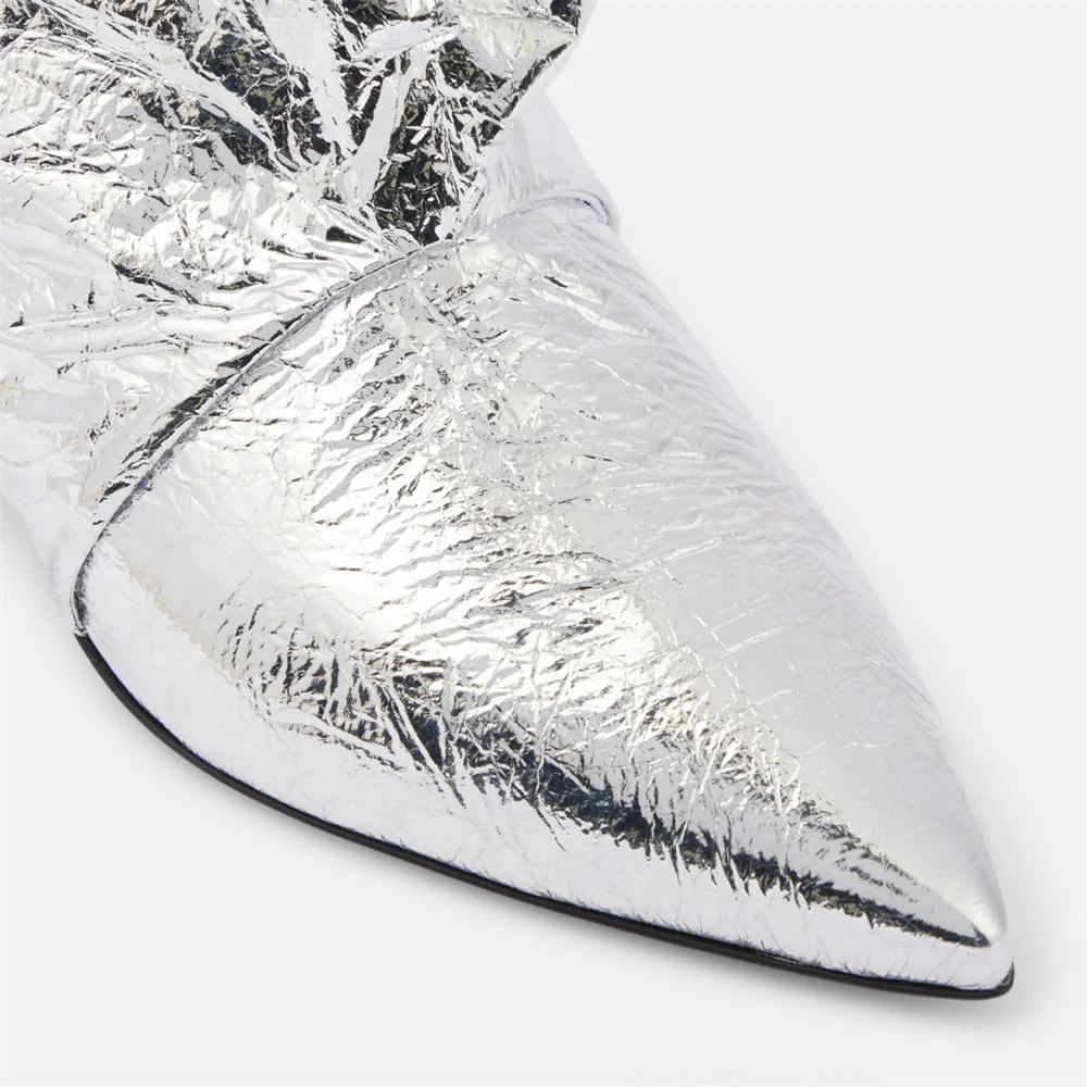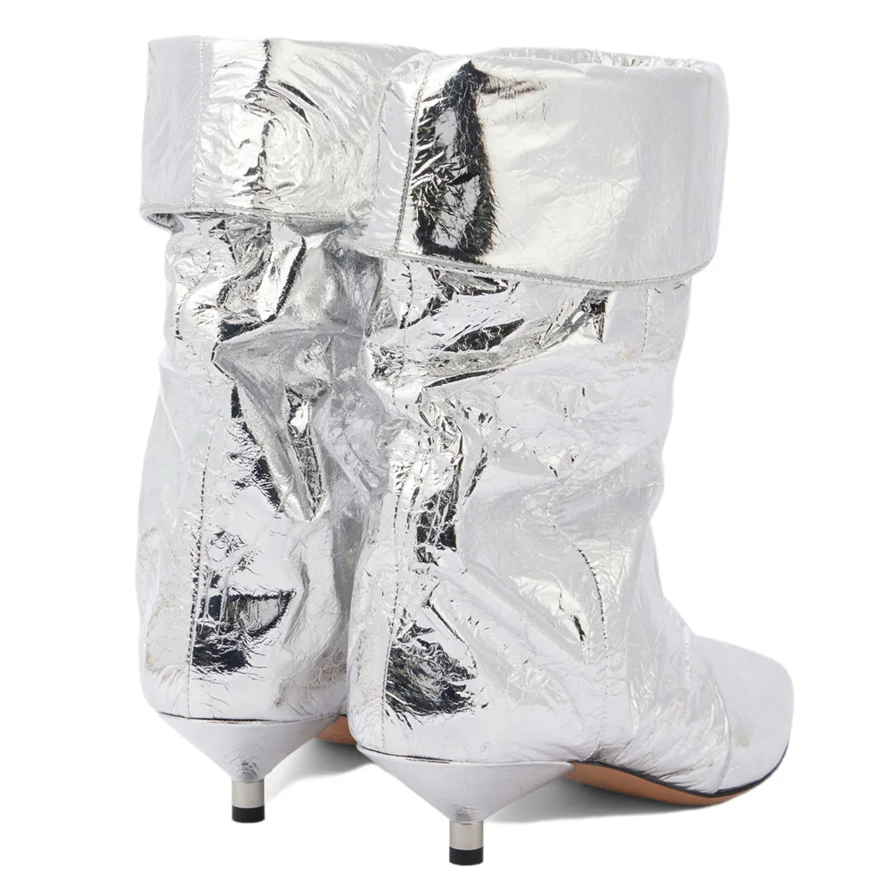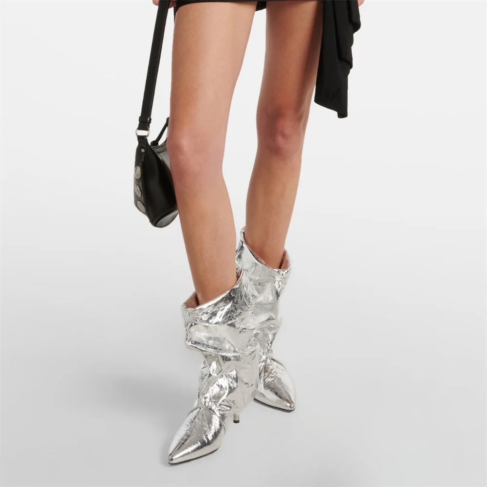 Arden Furtado 2025 Spring leopard print Large tubular boots Pointed toe Slip-on Pleated Middle heel Modern boots Short boots