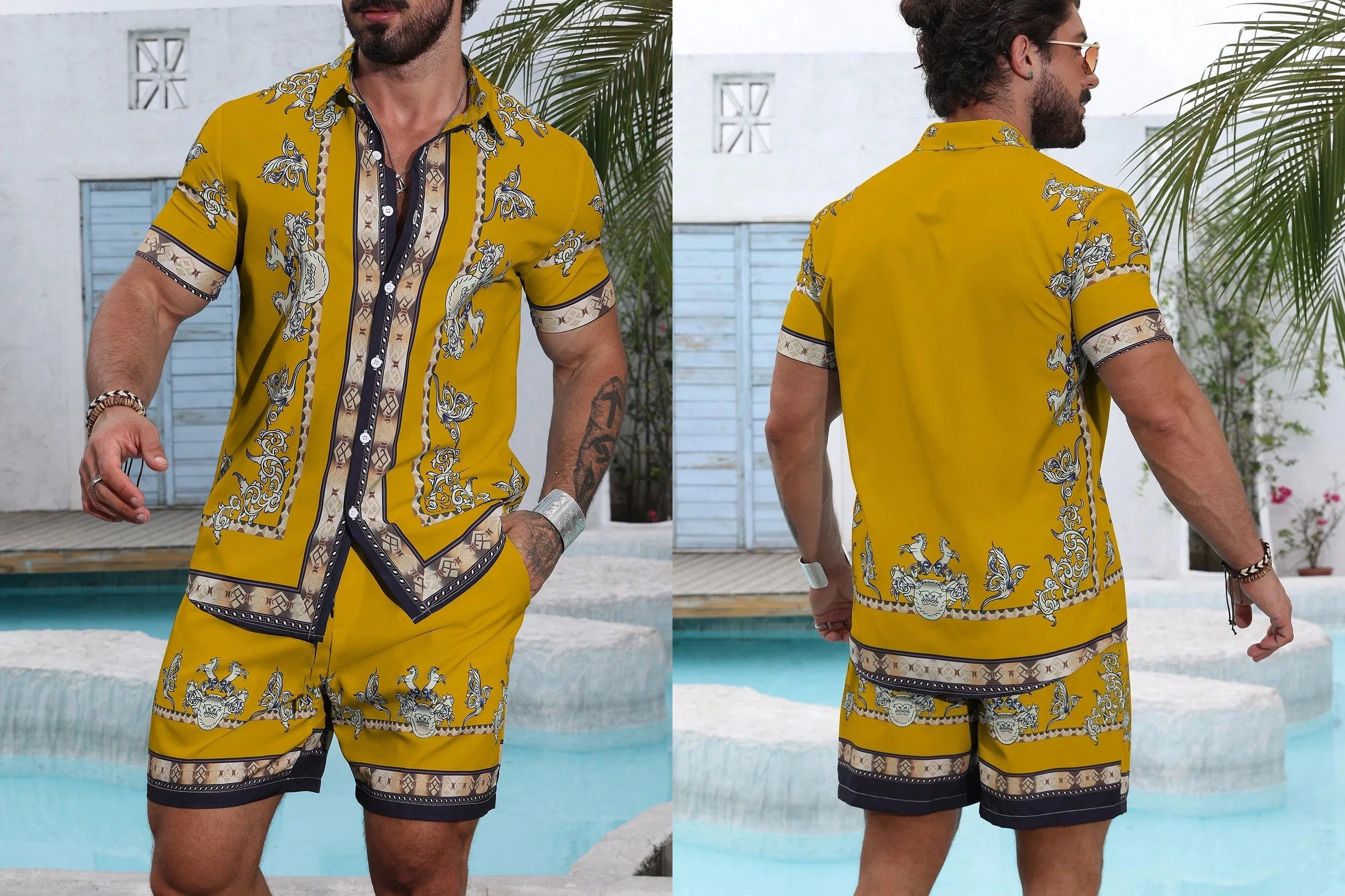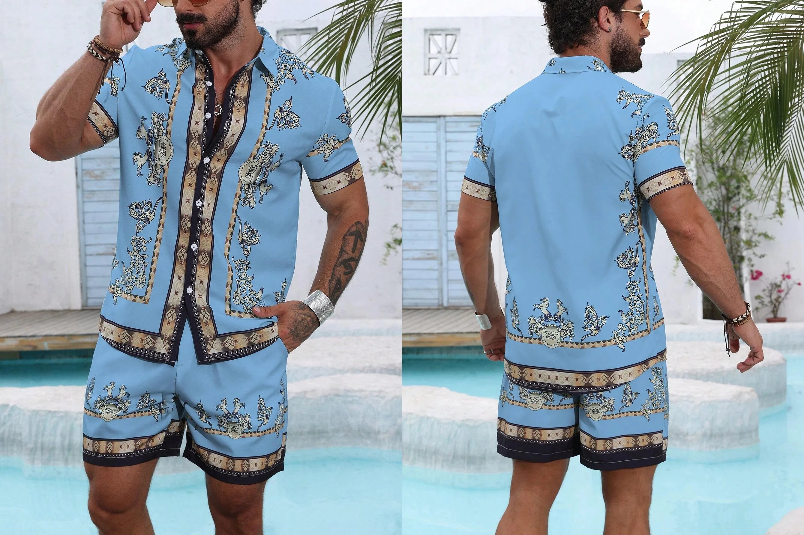 Baroque Luxury Printed Men's Shirt Shorts 2 Piece Set Summer Casual Shirt Hawaiian Beach Short-sleeved Men's Suits Clothing