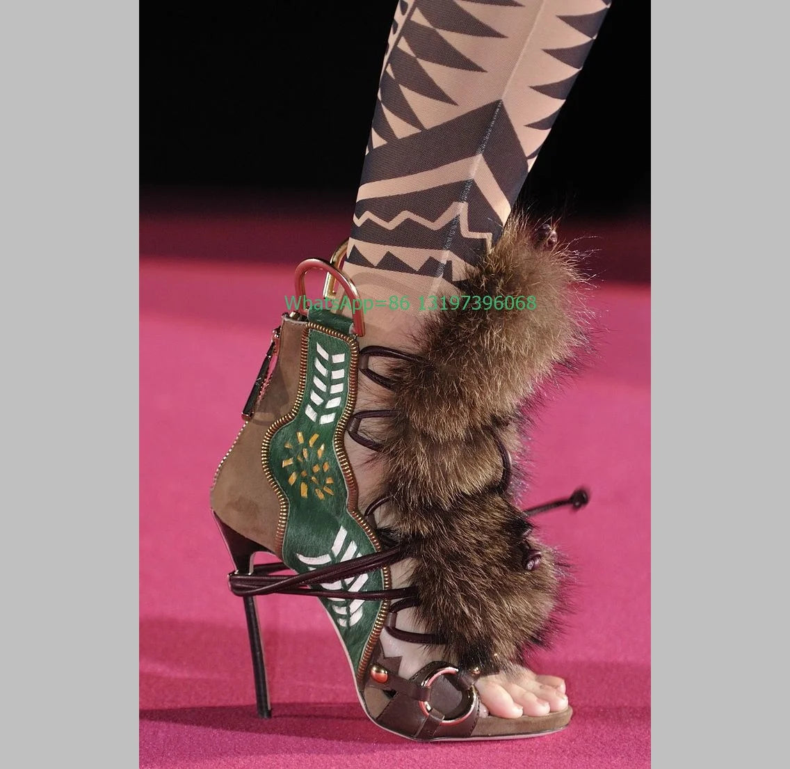 Lady Cowboy Style Fur Peep Toe Pumps Footwear Lace-Up Cut-Out Open Toe Back Zip Lace-Up Brown Cowboy High Heels Fall Size 35-45