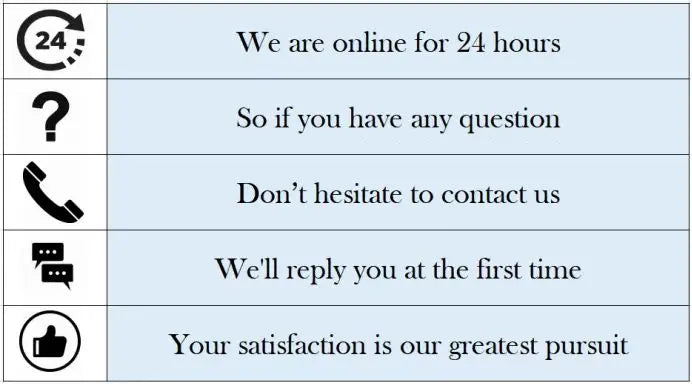 If you receive and like our items, we looking forward for your positive evaluate, that means a lot to us. If you don`t contentment, don't worry just contact us, please don`t add bad feedback, and we will answer your questions within 24 hours, we willtry our bestto find the best solutions for you.