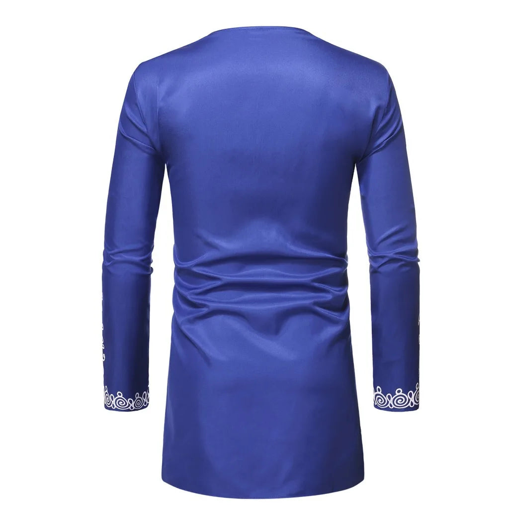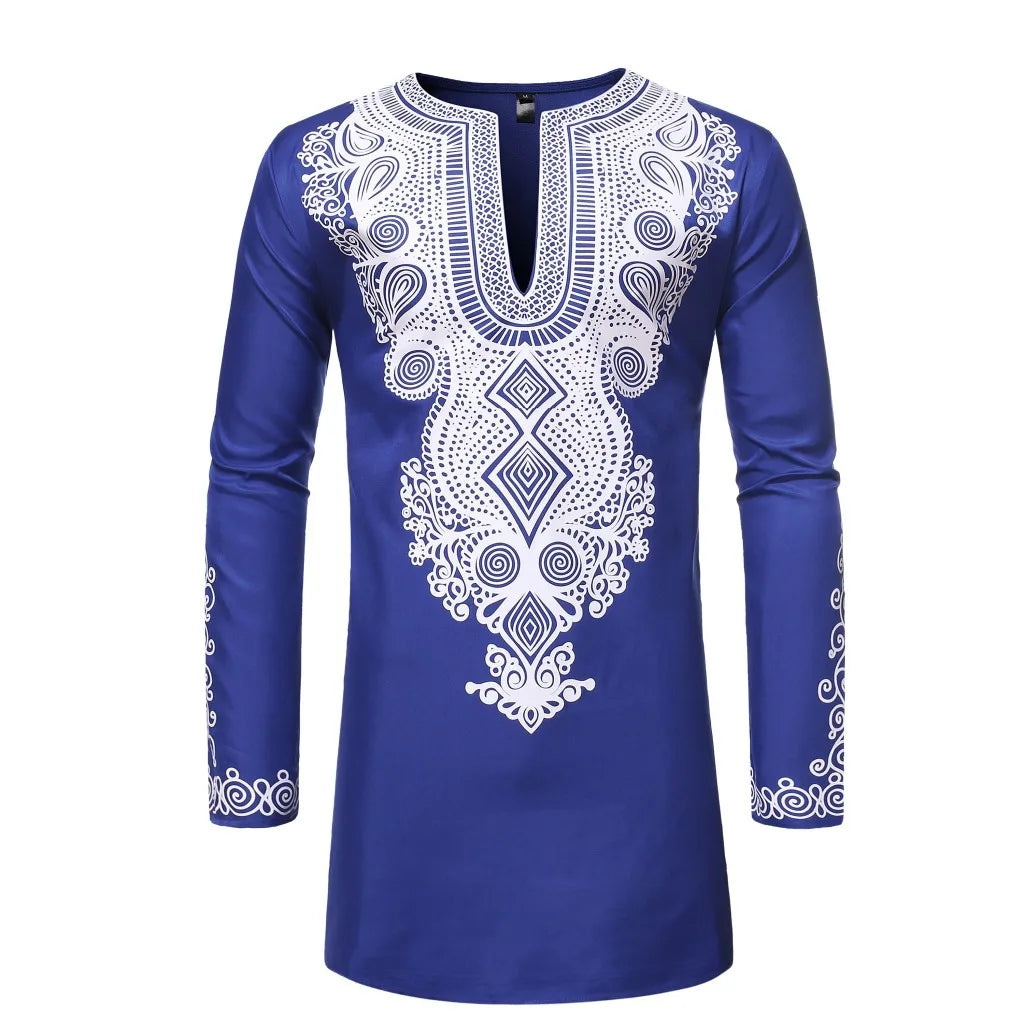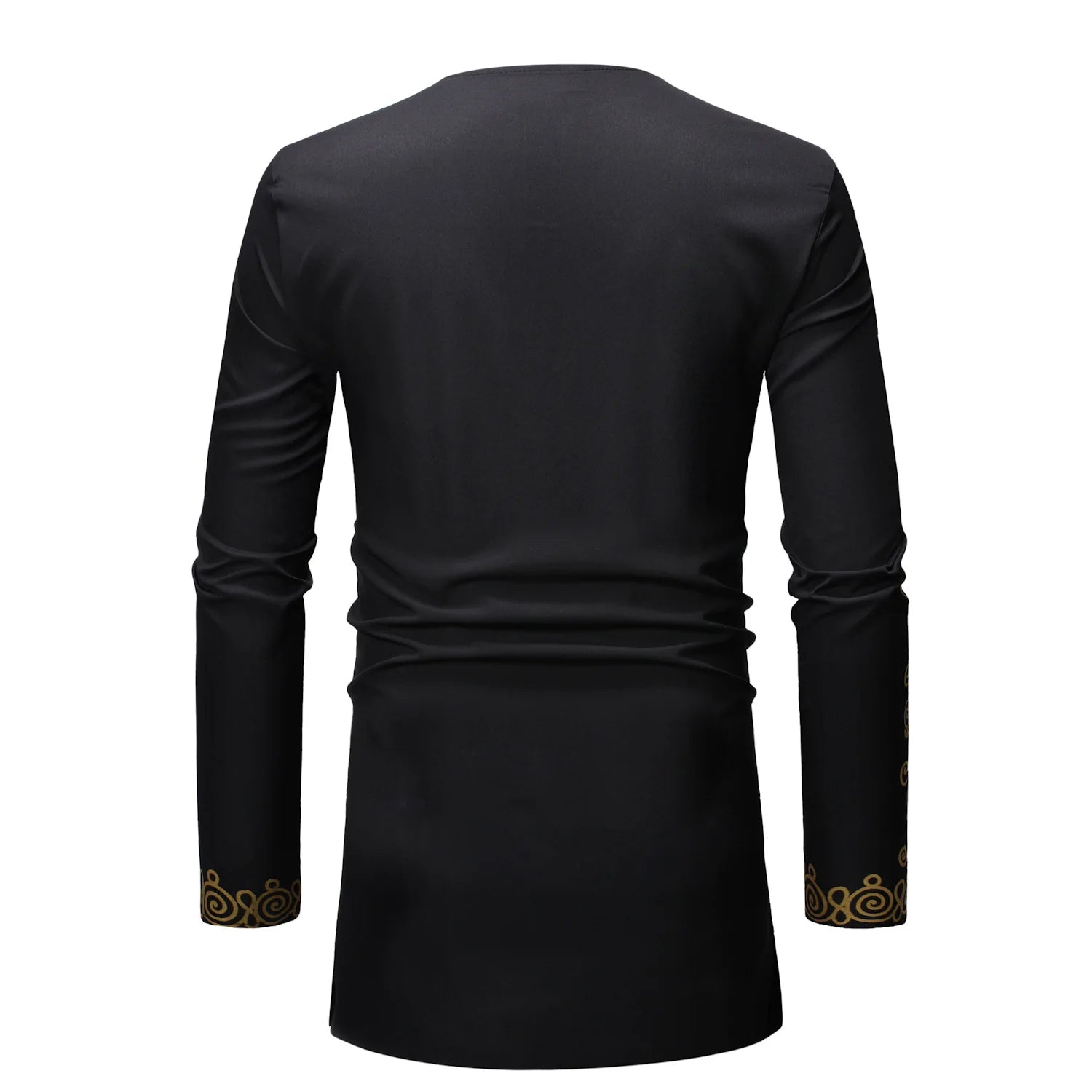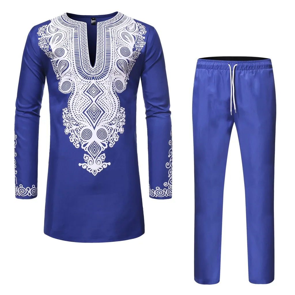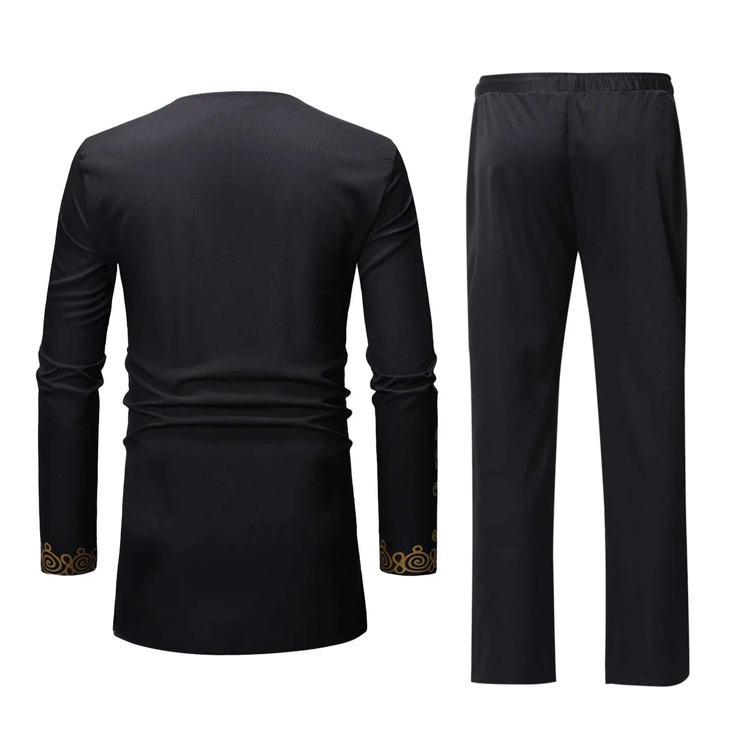 African Men's Shirt Pants Set Metallic Print Tops Long Sleeves Clothing V Neck Matching Traditional Suit With Trouser For Men